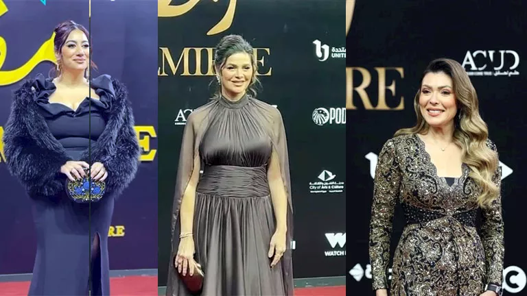 اختارت فيفي عبده فستانا ذهبيا ميتاليك، ونسقت معه "جاكيت" ضخم من الفراء بألوان طبيعية، ممسكة بحقيبة يد مرصعة بالكريستال، مما عكس شخصيتها المحبة للظهور القوي.