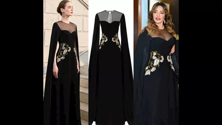 الفستان من تصميم Tracy Studio، وهو موديل Velvet Satin Cape Sleeve Gown In Black.