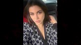 أطلت مرتدية توب باللون الأسود بأكمام طويلة مزيناً بنقشة مونوجرام بيضاء وهي علامة مميزة لدار الأزياء العالمية غوتشي، ونسقت الكارديجان مع قطعة داخلية سوداء.