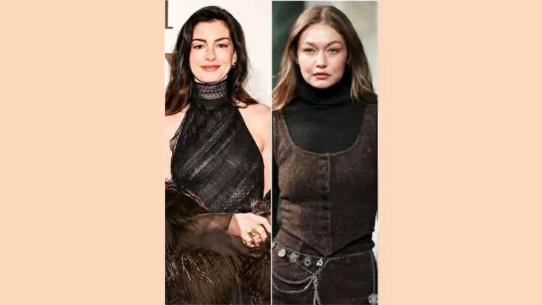 ظهرت عارضة الأزياء جيجي حديد بكروب توب مكون من قطعتين باللون البني الداكن بقصة "الكورساج"، مع حزام فضي عند الخصر وتوب أسود، مع مكياج ناعم وحقيبة يد باللون الأسود.