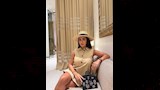 نسقت يمنى إطلالتها مع حقيبة يد باللون الأسود مزينة بنقوش مميزة، بالإضافة إلى إكسسوارات بسيطة مثل قبعة رأس وساعة يد، ما أضفى لمسة أنيقة على المظهر.