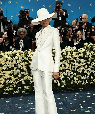 ظهرت الممثلة والمغنية الأمريكية زيندايا بـ بدلة باللون الأبيض ونسقت أسفلها قميص بنفس اللون، واعتمدت مكياجا ترابيا.