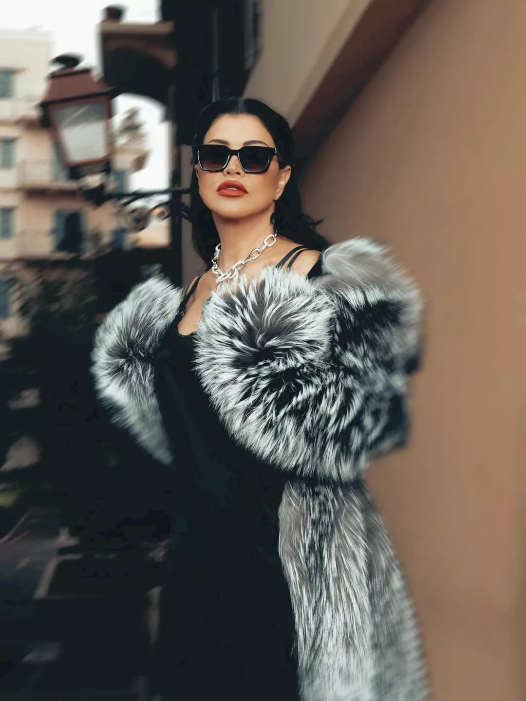 تألقت الفنانة جومانا مراد بفستان قصير باللون الأسود مصنوع من قماش الساتان والشيفون من الأعلى، ونسقت مع إطلالتها جاكيت فرو طويل باللون الرصاصي