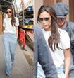 فيكتوريا اختارت طلة بسيطة وكلاسيكية مع كنزة بيضاء فضفاضة بأكمام قصيرة وسروال طويل واسع باللون الأزرق السماوي من أحدى ماركاتها المفضلة وهي Chloe. الشيء الوحيد المزعج في اللوك هو الطول الزائد للسروال.