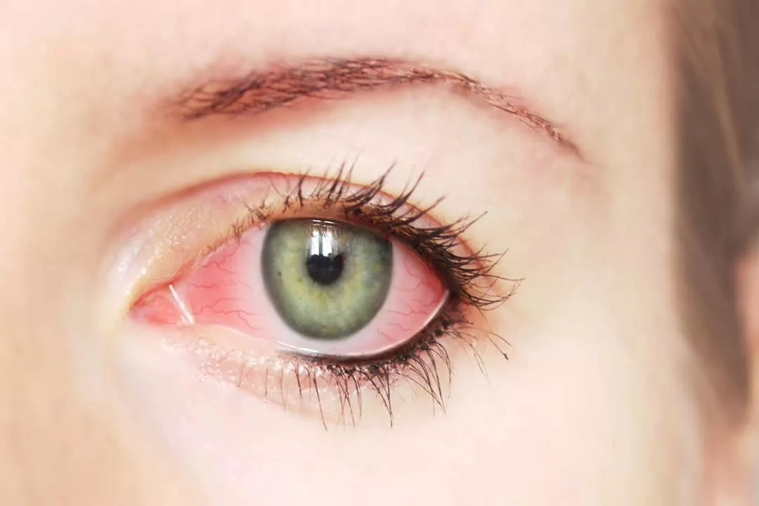 يصبح لون بياض العين مائلًا إلى الأحمر، أو قد ترى الأوعية الدموية واضحة، أو تنشأ احمرار في الجفن.