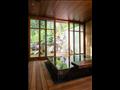 1-حوض استحمام مستطيل الشكل ضمن كوخ خشبي على الطراز الياباني.