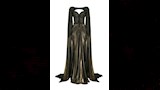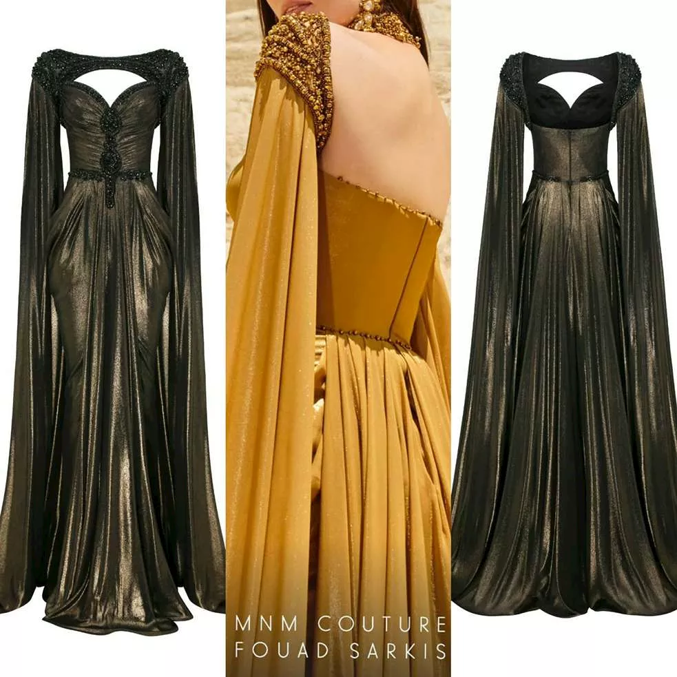 اختارت فستانًا من توقيع المصمم فؤاد سركيس، جاء بتصميم ملوكي بدرجة الذهبي البرونزي اللامع، من قماش الموسلين كريب الذي ينسدل بانسيابية.