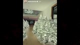 ظهرت كيم وهي تتجول داخل ردهة منزلها التي تحولت إلى ممر يشبه عالمًا خياليًا؛ صفوف متراصة من أشجار الكريسماس العملاقة المغطاة بالثلج الصناعي، تتلألأ فوقها إضاءات بيضاء ناعمة، مما خلق مشهدًا يشبه مدخل فيلم عيد الميلاد الكلاسيكي.