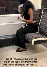 واقعة غريبة شهدها مترو لندن، بعدما أقبلت امرأة على صبغ شعرها، حيث استغلت طول مدة رحلتها بالمواصلات العامة، لإنجاز هذه المهمة الغريبة.