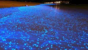 وخلال الفترة الممتدة بين شهري يونيو وأكتوبر، تتحول مياه البحر عند حلول الظلام إلى مشهد بصري استثنائي، حيث تتلألأ بالأضواء الزرقاء نتيجة كائنات بحرية دقيقة مضيئة، ما يمنح الزائر إحساسا وكأن النجوم قد انتقلت من السماء إلى سطح البحر.