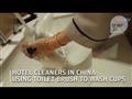 وكشف المقطع الذى أذاعته قناة "South China Morning Post" إستخدام عاملة النظافة بأحد الفنادق الفرشاة التى نظفت بها المرحاض وحوض الحمام في تنظيف أكوب الشاي ،.