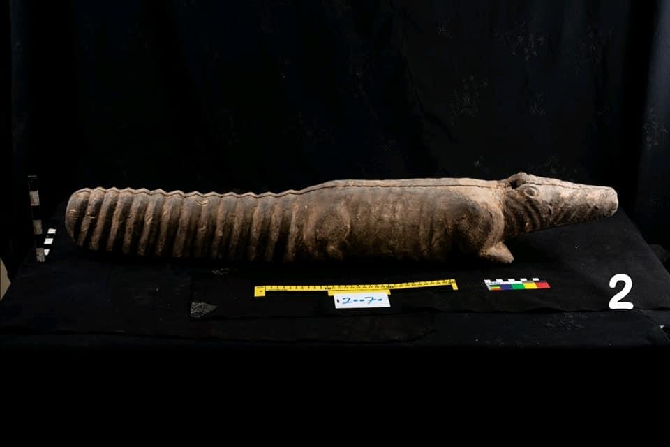 وعن القطعة الثانية، قال مدير المتحف إنها عبارة عن تابوت مجوف من الداخل بداخله مومياء محنطة لتمساح، وتتضح عليه العلامات التشريحية للجسد من أعلى، ومن الرجلين من الأمام، ونجد على التابوت طبقة من البلاستر والجص، ويعلو رأس التمثال تجويف مستطيل لتثبيت شيء ما، وهو مصنوع من الخشب، ويبلغ طوله 92 سنتيمتر، وعرضه 15 سنتيمتر، ويعود للعصر المتأخر، والموقع السابق له المخزن المتحفي 2 بسقارة.​