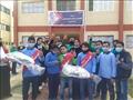 رفعت والدة الشهيد مجند مقاتل عبدالغني الزيني، علامة النصر، اليوم الأربعاء، مع تلاميذ المدرسة التي تحمل اسم ابنها بمنطقة القابوطي في محافظة بورسعيد.