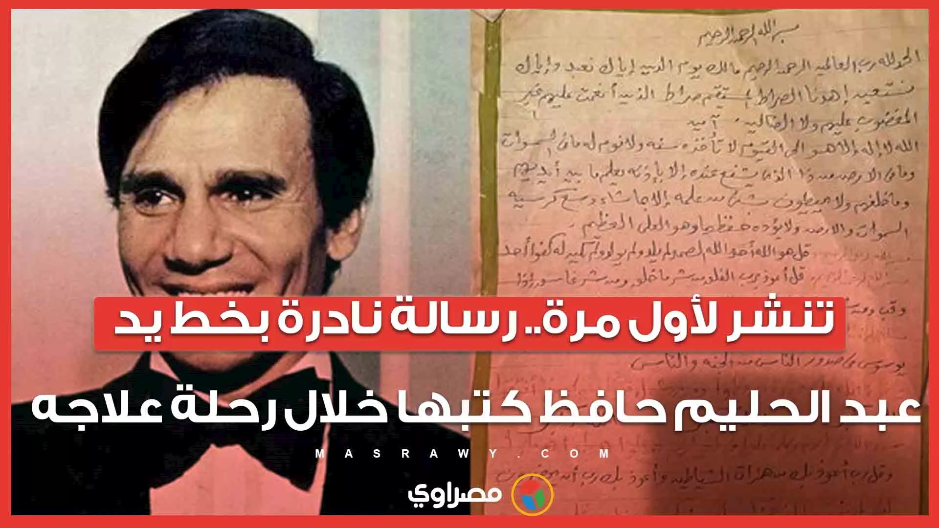 الرئيسية أخبار مصراوى TV تنشر لأول مرة.. رسالة نادرة بخط يد عبد الحليم حافظ كتبها خلال رحلة علاجه كتب : مصراوي 09:00 م 23/03/2026 تابعنا على لمعرفة حالة الطقس الآن اضغط هنا لمعرفة أسعار العملات لحظة بلحظة اضغط هنا عبدالحليم حافظ