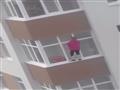 سيدة تقف على "سور بلكونة" في الطابق الخامس لتنظيف شقتها - فيديو