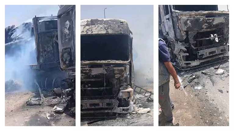 كانت غرفة عمليات الحماية المدنية قد تلقت بلاغًا يفيد بنشوب حريق في إحدى سيارات النقل على الطريق الإقليمي، وعلى الفور تم الدفع بسيارتي إطفاء إلى موقع البلاغ.