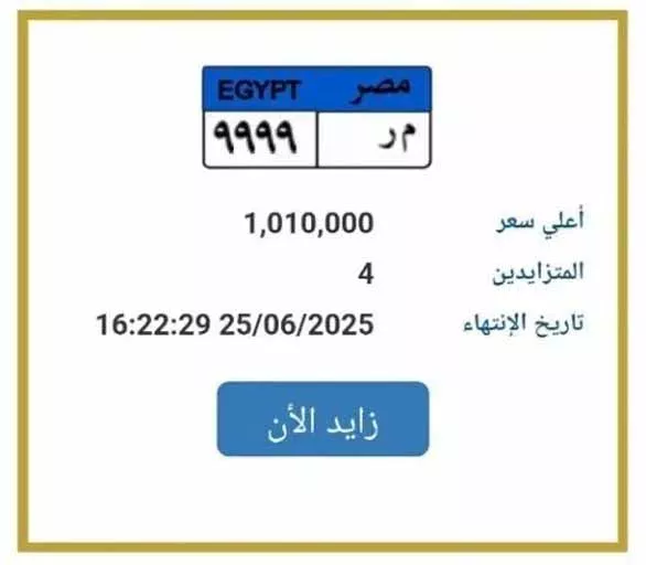 تشهد بوابة مرور مصر الإلكترونية مزايدة نارية على لوحة معدنية مميزة تحمل الرقم "م ر 9999"، حيث تجاوز سعرها حاجز المليون جنيه، ويتنافس على شرائها حتى الآن 4 أشخاص، على أن تنتهي المزايدة مساء اليوم الأربعاء 25 يونيو 2025.