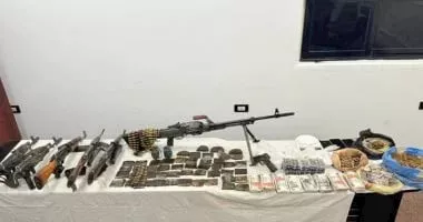 3- 7 قطع سلاح نارى "5 بنادق آلية ، رشاش جرينوف ، طبنجة" – 2 قنبلة يدوية - عدد كبير من الطلقات مختلفة الأعيرة).