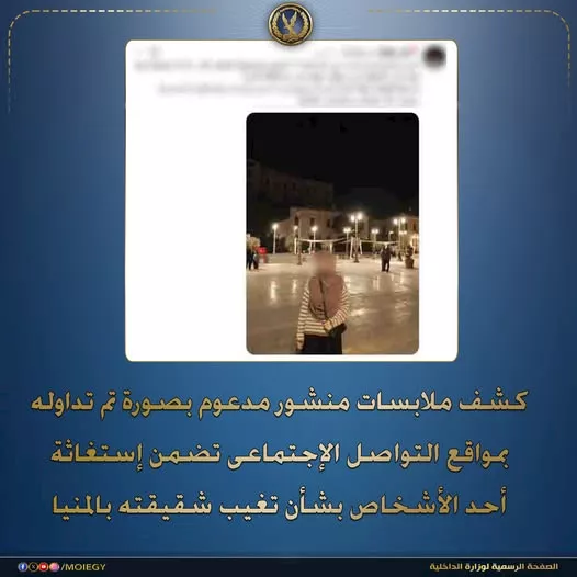 كشفت الأجهزة الأمنية ملابسات منشور مدعوم بصورة تم تداوله بمواقع التواصل الاجتماعي تضمن استغاثة أحد الأشخاص بشأن تغيب شقيقته بالمنيا.