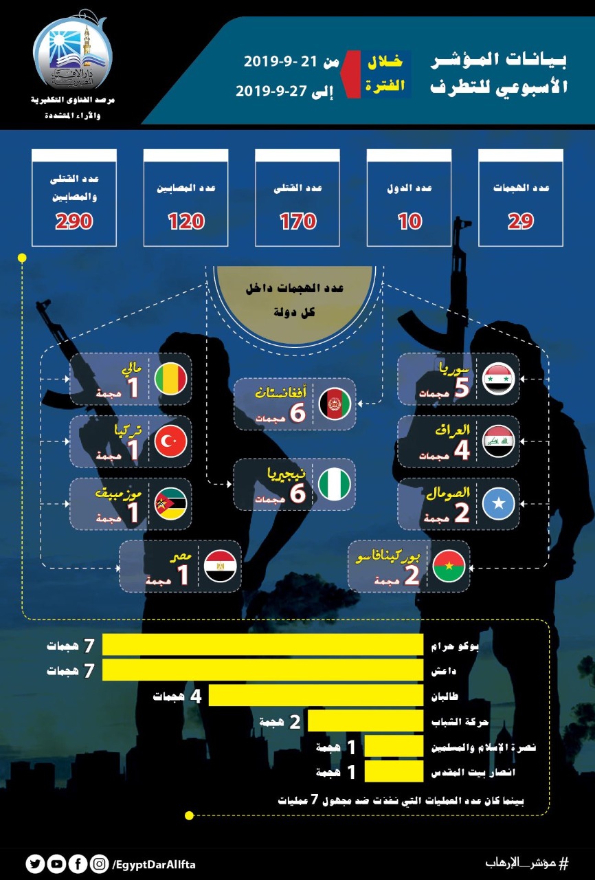 مرصد الإفتاء: الأسبوع الأخير من سبتمبر شهد 29 عملية إرهابية في 10 دول