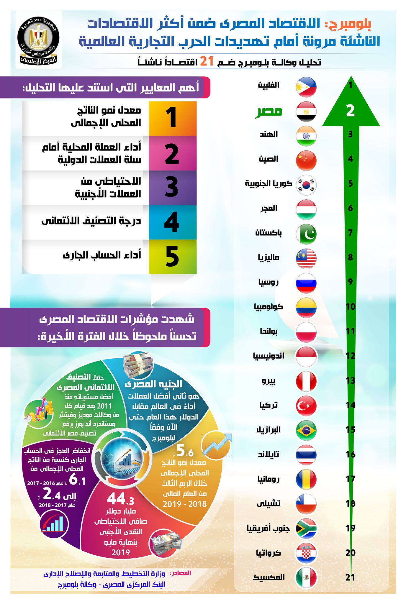 نشر المركز الإعلامي لمجلس الوزراء، إنفوجراف سلط من خلاله الضوء على وضع وكالة "بلومبرج" العالمية، الاقتصاد المصري ضمن أكثر الاقتصادات الناشئة مرونة أمام تهديدات الحرب التجارية العالمية، لتحتل مصر المرتبة الثانية بعد دولة الفلبين، ضمن 21 اقتصادًا ناشئاً على مستوى العالم.