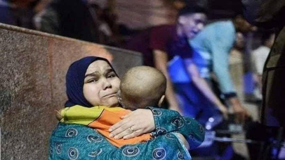 في غرفة رقم 5، بالدور الخامس بالمعهد القومي للأورام، كانت فايزة "أم عبدالرحمن" -صاحبة الصورة الأشهر على "فيسبوك"- تجلس تحتضن نجلها، تضع له الكمادات؛ لتخفيف الحرارة المرتفعة التي كان يعاني منها، قبل أن يدوي صوت الانفجار "كان عنده سخونية شديدة حوالي الساعة 11 ونص وكنت بحاول أنزله الحرارة".