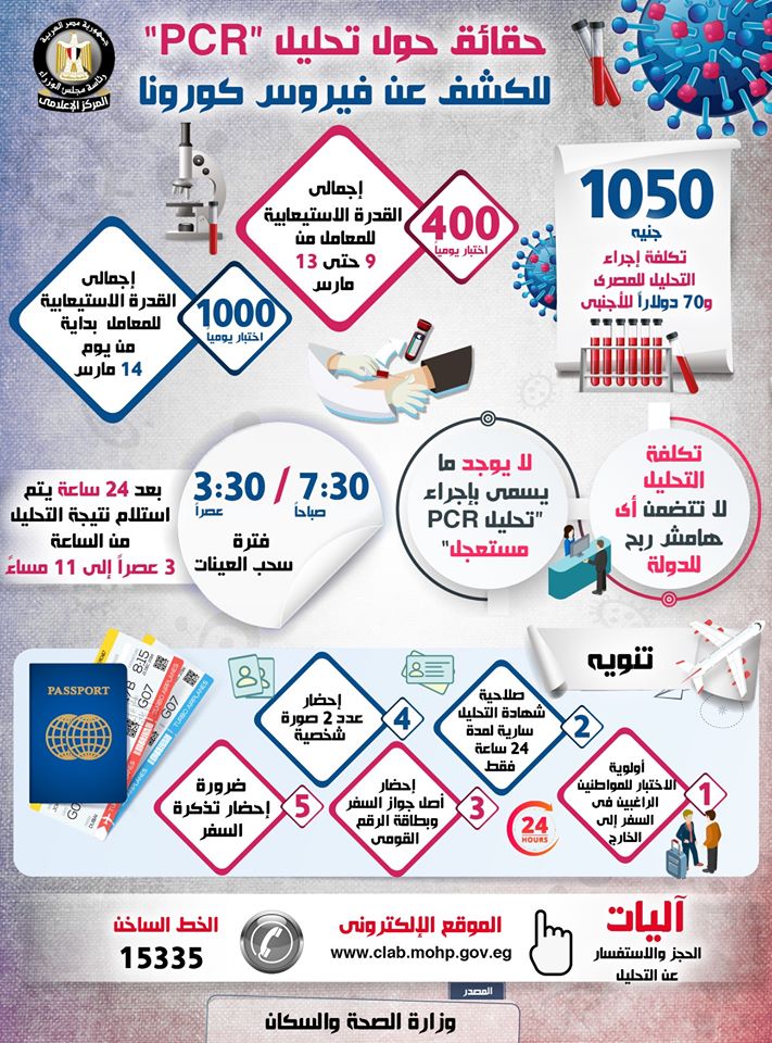 في إطار حرص الدولة المصرية على تسهيل الإجراءات اللازمة لإجراء تحليل PCR"" للكشف عن فيروس "كورونا" للمواطنين الراغبين في السفر للدول التي تشترط إجراء هذا التحليل،