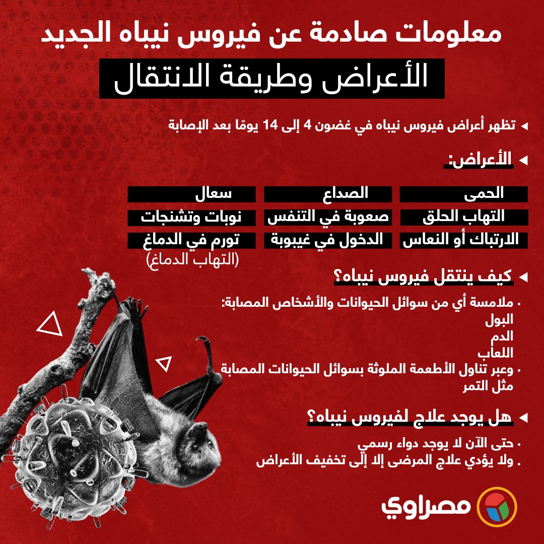 قال الدكتور أحمد رزق، أستاذ الحيوانات الضارة بمركز البحوث الزراعية، إن مصر لم تسجل حالة إصابة واحدة بفيروس "نيباه"، مشيرًا إلى أن الفيروس موجود منذ عام 1989 في ماليزيا.