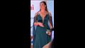 ارتدت الفنانة اللوزي، فستانا طويل، بصيحة الأوف شولد، وبفتحة صدر على شكل V، واكمام طويلة بقماش الشيفون، باللون الزيتي.