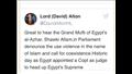 فيما غرد اللورد ديفيد ألتون السياسي البريطاني العضو المستقل في لجنة العلاقات الدولية والدفاع في مجلس اللوردات: "من الرائع سماع مفتي مصر شوقي علام في البرلمان يندد باستخدام العنف باسم الإسلام ويدعو إلى التعايش".