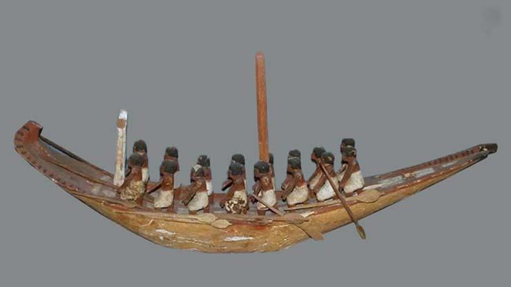 يعرض نموذج لمركب مصنوع من الخشب من عصر الدولة الوسطى عليها عدد 2 ساري و16 بحار يحمل كل واحد فيهم مجداف.