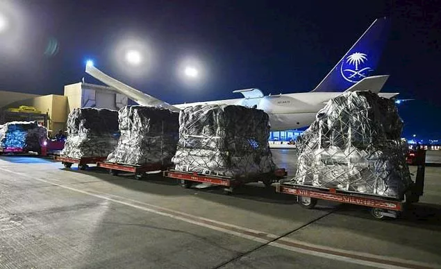 استقبل مطار العريش الدولي بمحافظة شمال سيناء، اليوم الجمعة طائرة مساعدات إنسانية متنوعة من السعودية لصالح الفلسطينيين بقطاع غزة.