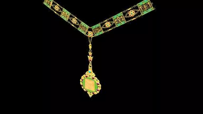 وللقلادة حلية تتصل بالسلسلة بمشبك على شكل زهرتي لوتس، والحلية ذات شكل دائري ومحلاة بزهرات فرعونية وبالميناء وبالفصوص الحمراء والزرقاء، وفي وسطها رسم بارز يمثل رمز النيل موحدًا بين الشمال الذي يمثله البردي والجنوب الذي يمثله زهرة اللوتس.