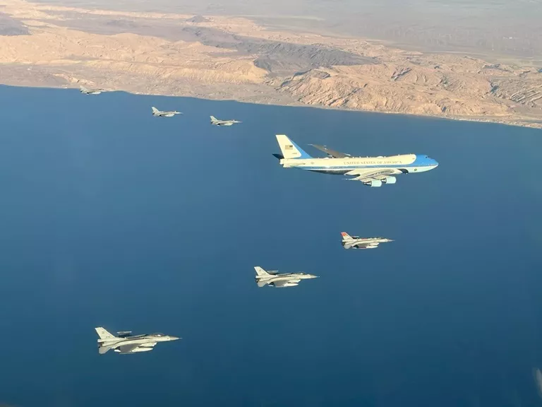 نشر المتحدث الرسمي لرئاسة الجمهورية مقطع فيديو يوثق مرافقة 6 مقاتلات f16 الحربية المصرية لطائرة الرئيس الأمريكي دونالد ترامب خلال دخوله الأجواء المصرية لحضور قمة شرم الشيخ للسلام وتوقيع اتفاقية إنهاء حرب غزة.