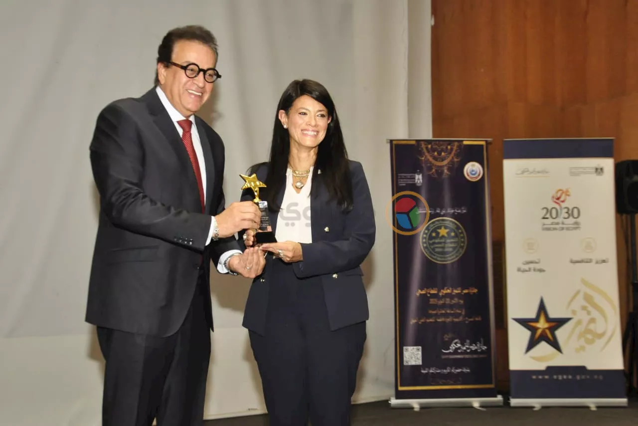 وخلال الفعالية، أهدت الدكتورة رانيا المشاط درع التميز للدكتور خالد عبدالغفار تقديرًا لجهوده في دعم مسيرة التميز المؤسسي وتعزيز مفاهيم الجودة في القطاع الصحي.