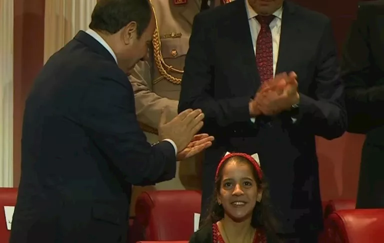 جلست بجواره.. السيسي يستجيب لطفلة فلسطينية طلبت لقائه باحتفالية "وطن السلام"