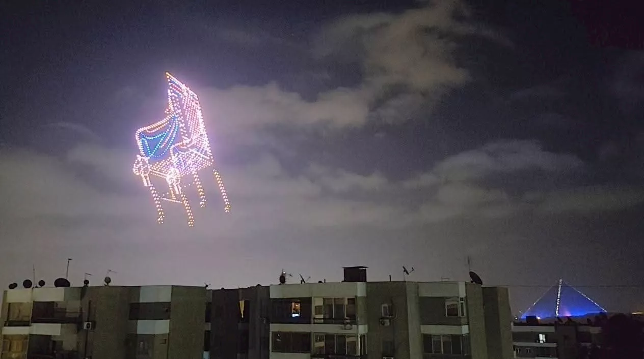 تجرى الآن "بروفات" مكثفة استعدادا لحفل الافتتاح، حيث قناع توت عنخ آمون يضئ سماء الأهرامات.