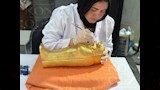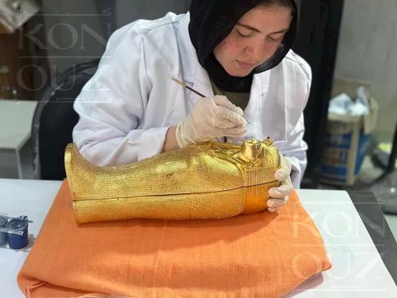 وأكمل شعراوي: بدأت العملية من قسم النحت، حيث تولّى الفنانون تجسيد الزخارف والرموز والكتابات الهيروغليفية بدقة التماثل الأصلية، ثم انتقلت إلى مراحل الاستنساخ فالتذهيب فالتلوين، قبل أن يُغلّف التابوت من الداخل بقماش المخمل الفاخر، لتظهر في صورتها النهائية التي تليق بعظمة الاحتفالية ومكانة المتحف.