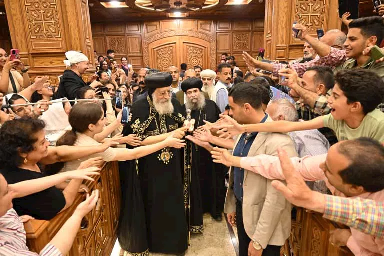 ولدى وصول قداسته، أزاح الستار عن اللوحة الرخامية التي تؤرخ لتدشين الكنيسة، والتقط الصور التذكارية ثم توجه إلى الكنيسة يتقدمه خورس الشمامسة مرتلين ألحان استقبال الأب البطريرك، وسط حفاوة كبيرة من الشعب.