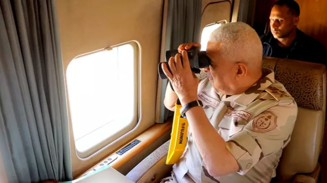 وشارك الفريق أول عبد المجيد صقر، المقاتلين تناول وجبة الغداء، كما تفقد جوًا بعض نقاط التأمين الحدودية المتمركزة بنطاق مسئولية المنطقة الغربية العسكرية.