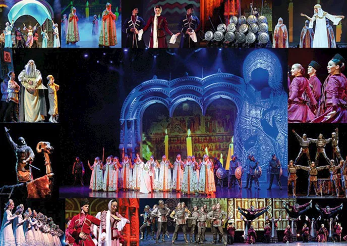ويتميز العرض بالثراء والإبهار من خلال تناول المحطات والمعالم التاريخية الهامة فى روسيا وتقاليدها وعاداتها ملتزماً بأسلوب الثقافة الشعبية التى تجمع بمهارة بين الفولكلور والحكايات الملحمية القديمة والمقاطع الغنائية والرقصات الإستعراضية منها روسيا القديمة، الصلاة، المدافعون، أنشودة الحنين، رقصة القوزاق الكبرى، تدفقات نهر الفولجا، رقصة الجدول الصغير العذب ، يوخور، الرقصة الكورياك، ربيع التتار، إيقاعات القوقاز، القلب الدافئ، شتاء شتاء والرقصة الإحتفالية.