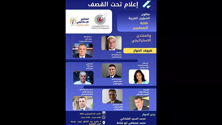 تنظم لجنة الشئون العربية والخارجية بنقابة الصحفيين بالتعاون مع المنتدى الإستراتيجي للفكر والحوار جلسة نقاشية بعنوان "إعلام تحت القصف: تقييم تموضع الفضائيات الإخبارية في تغطية حروب الشرق الأوسط"، وذلك في تمام الساعة السادسة مساء غدا الأحد الموافق 10 أغسطس المقبل، بالدور الثالث في مقر النقابة.