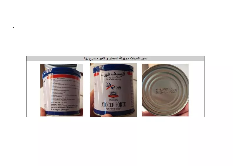 حذرت هيئة الدواء المصرية من عبوات مغشوشة من المستحضر البيطري "Atocef Forte Water-Soluble Powder for Vet"، خاصة التشغيلة رقم "102665".