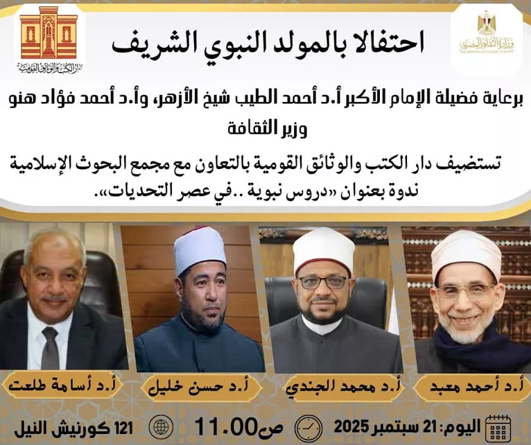 تستضيف الهيئة العامة لدار الكتب والوثائق القومية، بالتعاون مع مجمع البحوث الإسلامية ندوة لمجلة الأزهر الشريف، بعنوان «في ذكرى المولد الشريف.. دروس نبوية في عصر التحديات»، وذلك بمقر دار الكتب والوثائق القومية في الحادية عشرة صباح الأحد 21 سبتمبر، احتفاءً بذكرى سيد الخلق صلى الله عليه وسلم.