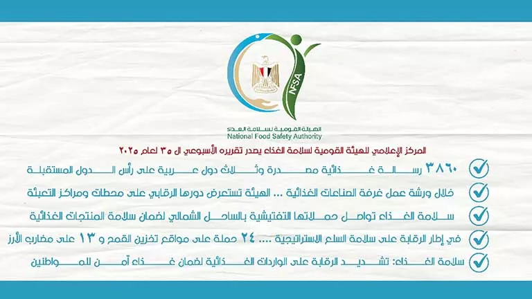 أصدر المركز الإعلامي للهيئة القومية لسلامة الغذاء تقريره الأسبوعي الـ 35 لعام 2025، عن الفترة من 20 - 26 سبتمبر، والذي تضمن العديد من الأنشطة المختلفة على رأسها تنفيذ الإدارة العامة للرقابة على المصانع 104 مأمورية تفتيشية بالتعاون مع مصلحة الرقابة الصناعية، استهدفت تقييم مدى التزام المنشآت الغذائية باشتراطات الجودة وسلامة الغذاء.