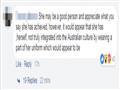 وكتب مواطن على صفحة شرطة فيكتوريا بموقع التواصل الاجتماعي "فيسبوك": "قد تكون شخصًا جيدًا وأقدر ما أنجزته، ومع ذلك يبدو حقًا أنها لم تندمج في الثقافة الأسترالية بسبب ارتدائها جزءًا من الزي الإسلامي (الحجاب)"