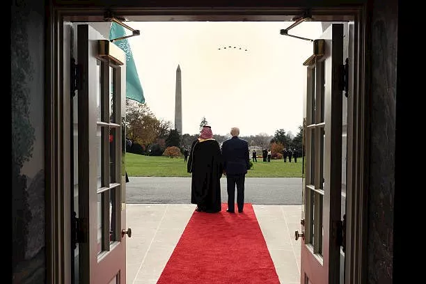 واستقبل ترامب ولي العهد السعودي عند نهاية البساط الأحمر، حيث خرج من سيارته المرسيدس وصافح الرئيس الأمريكي بحرارة، ورافق الحرس الشرفي العسكري الأمريكي موكب ولي العهد في ممر الحديقة الجنوبية، حاملين العلمين الأمريكي والسعودي.