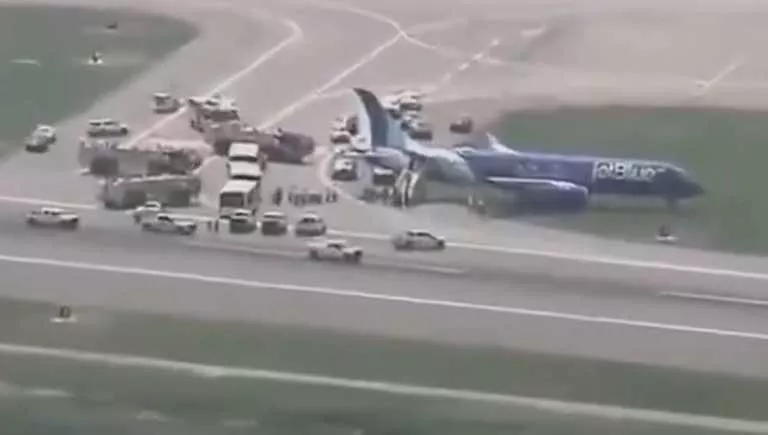 وأظهرت الصور الركاب وهم ينزلون من الطائرة من طراز إيرباص A220 عبر السلالم المحمولة بعد توقفها على العشب خارج المدرج.