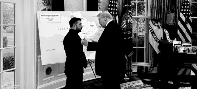 التقى الرئيس الأمريكي دونالد ترامب، أمس الاثنين، بنظيره الأوكراني فولوديمير زيلينسكي في واشنطن. وخلال الاجتماع، عرض ترامب على زيلينسكي في المكتب البيضاوي خريطة كبيرة تُظهر الأراضي الأوكرانية التي استولت عليها روسيا.