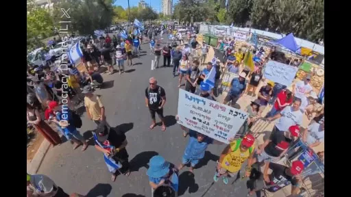أظهر مقطع فيديو مصور تجمع عشرات الإسرائيليين أمام مكتب رئيس الوزراء بنيامين نتنياهو، وذلك احتجاجًا على الحرب في قطاع غزة، مطالبين بوقف الحرب بين إسرائيل والاحتلال والتوصل لوقف إطلاق نار بين الطرفين وإطلاق سراح الأسرى.